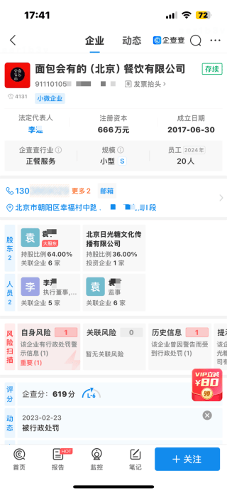 企某查消息显示,“面包会有的”品牌所属从体为“面包会有的()餐饮无限公司”,成立于2017年6月30日,注册本钱666万元,法报酬李某。而该公司大股东恰是袁丁(袁丁系原名,现为袁弘),持股比例高达64%,张歆艺取袁弘佳耦不只是品牌创始人,还亲身为其代言推广。